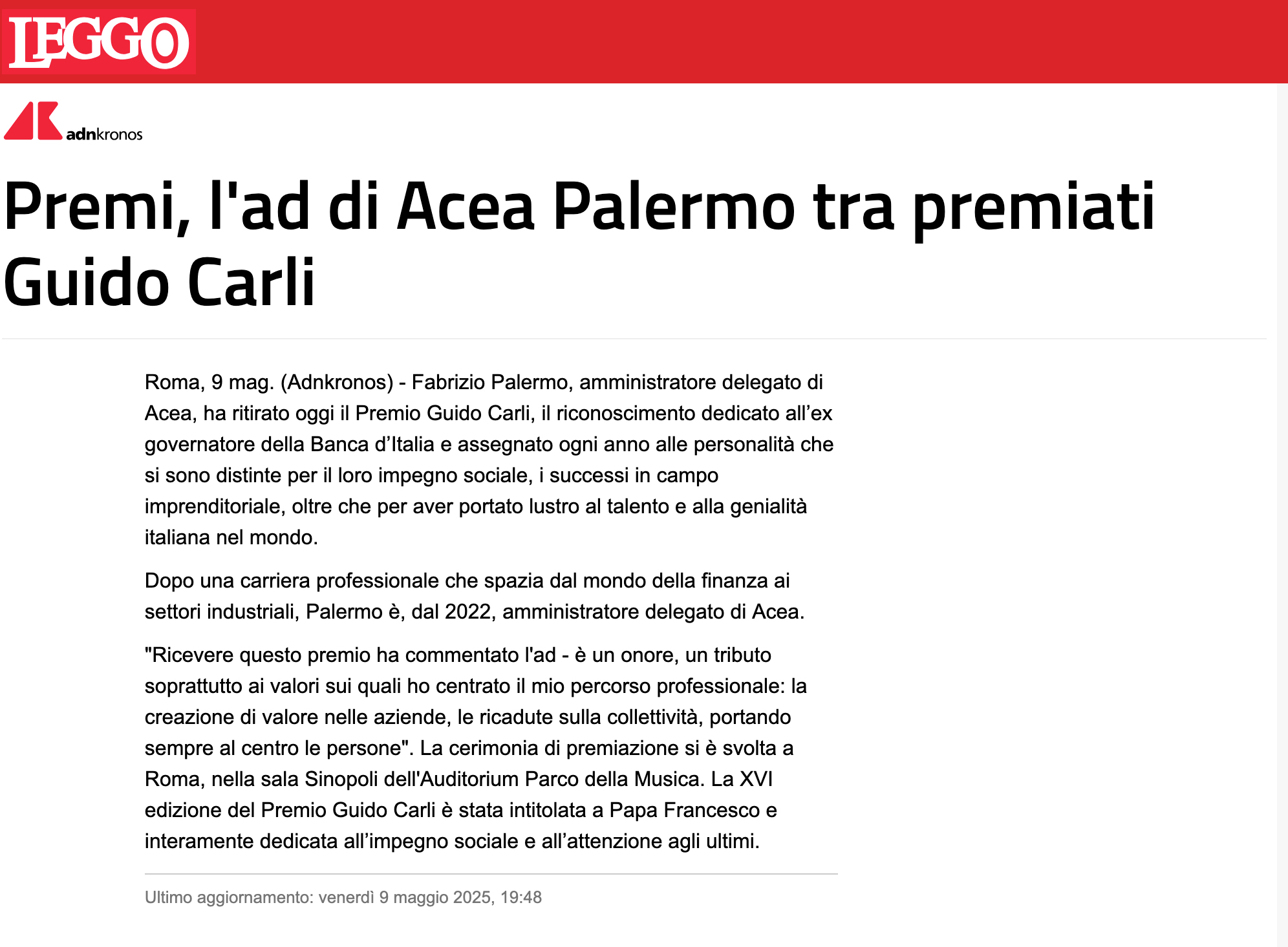 Adnkronos – Premi, l’ad di Acea Palermo tra premiati Guido Carli