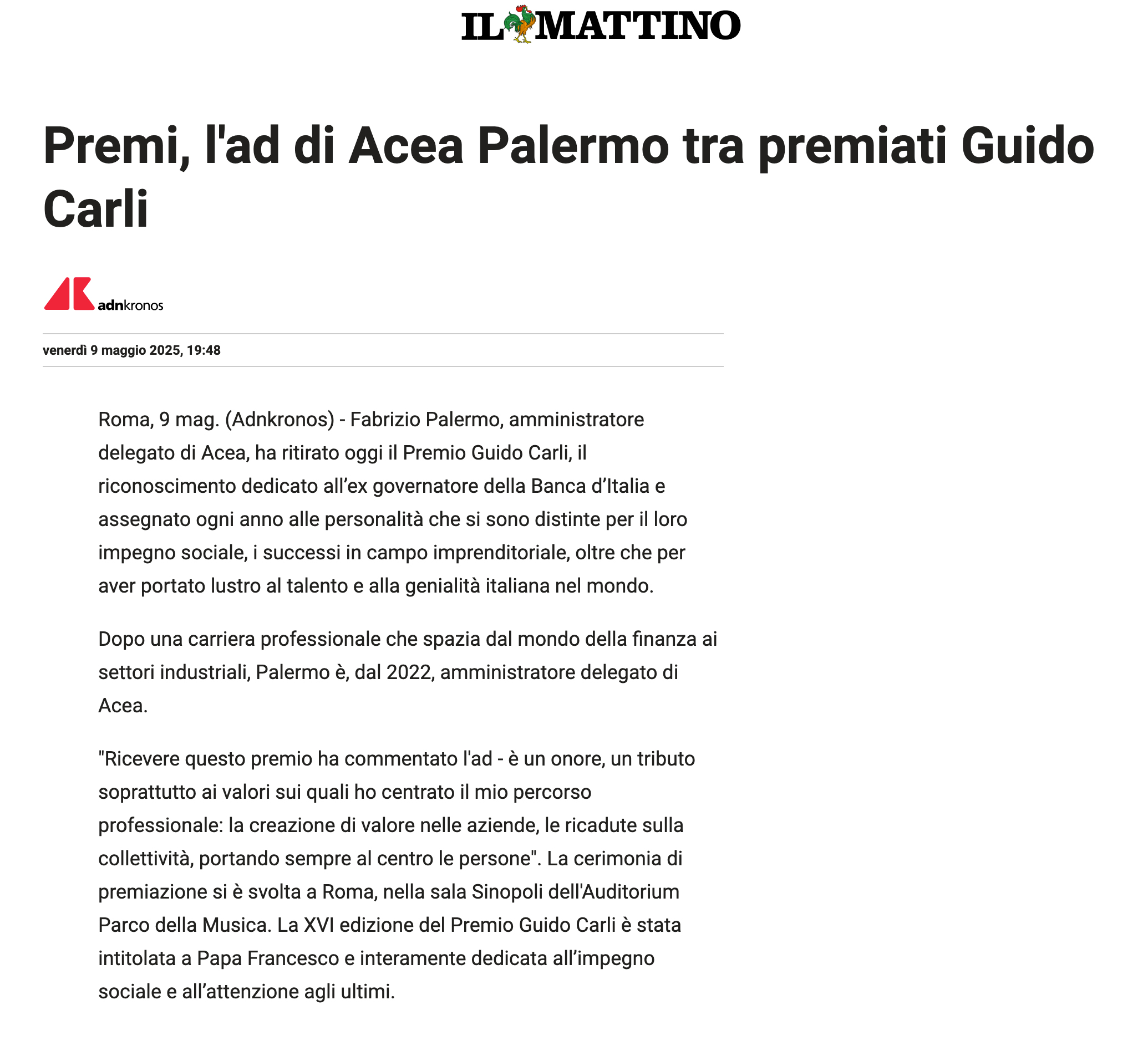 Affari Italiani – Premi, l’ad di Acea Palermo tra premiati Guido Carli