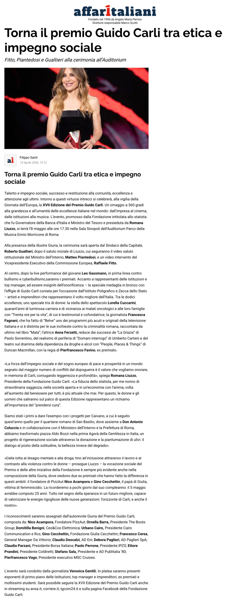 Affari Italiani – Torna il premio Guido Carli tra etica e impegno sociale