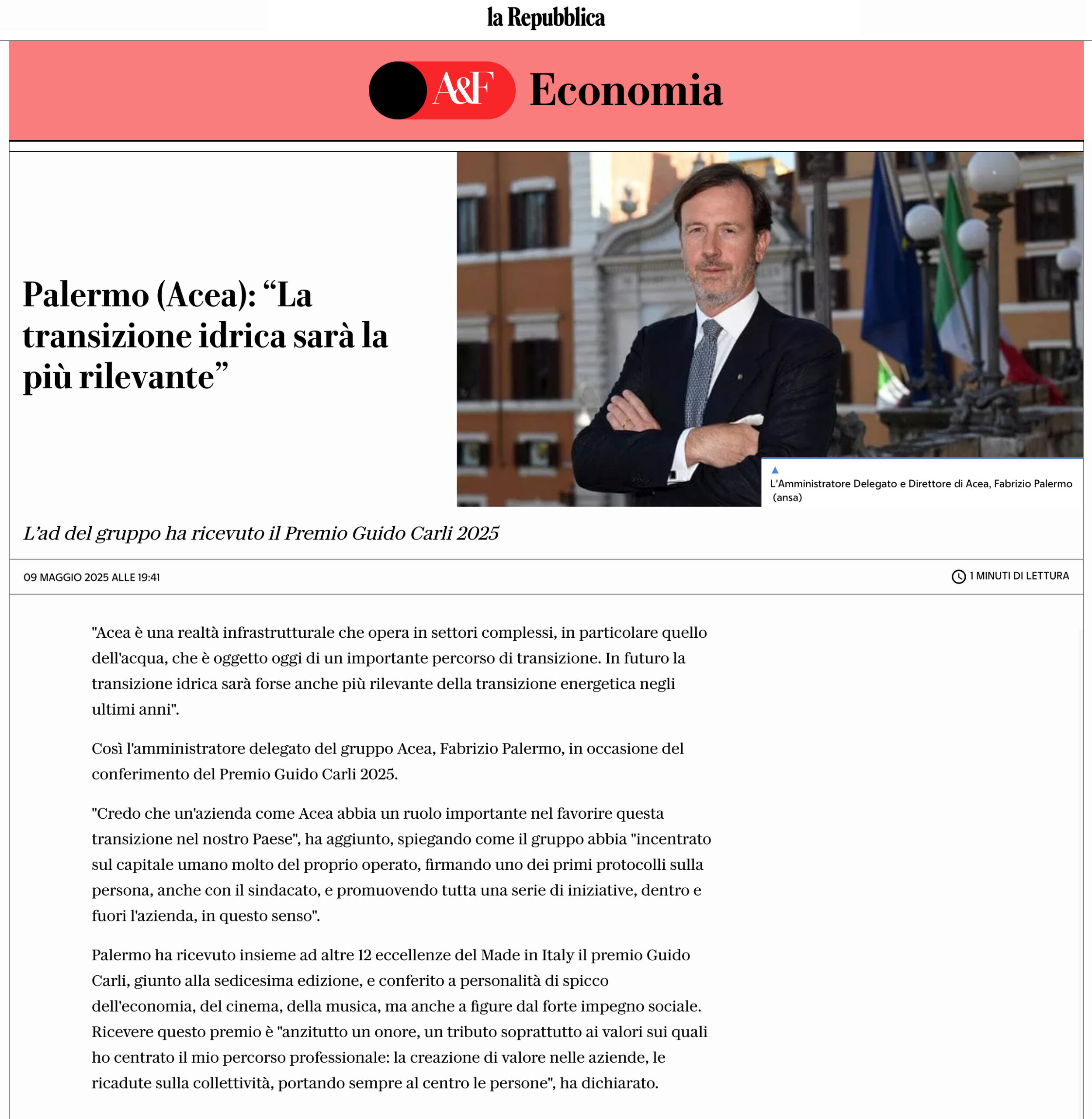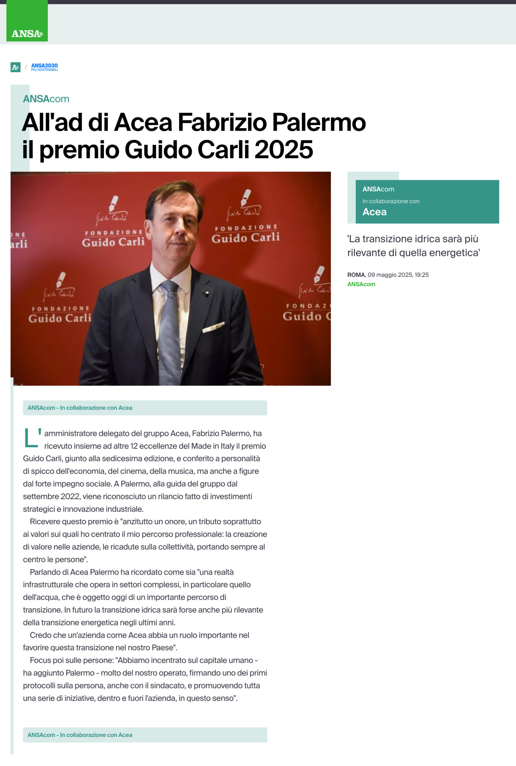 Ansa – All’ad di Acea Fabrizio Palermo il premio Guido Carli 2025
