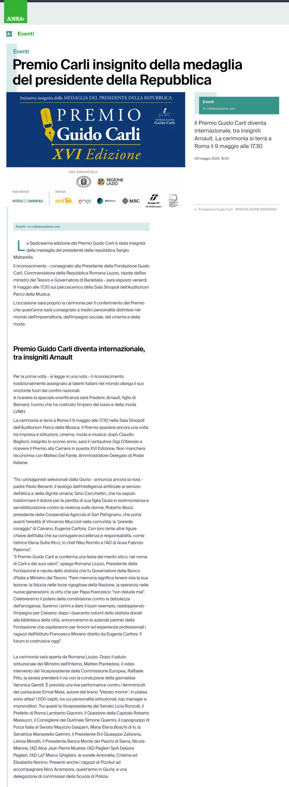 Ansa – Premio Carli insignito della medaglia del presidente della Repubblica