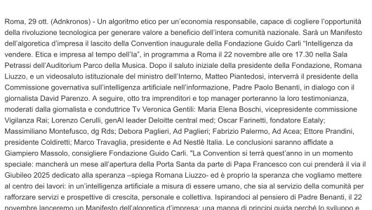 (AGI) - Roma, 29 ott. - Un algoritmo etico per un'economia responsabile, capace di cogliere l'opportunita' della rivoluzione tecnologica per generare valore a beneficio dell'intera comunita'...