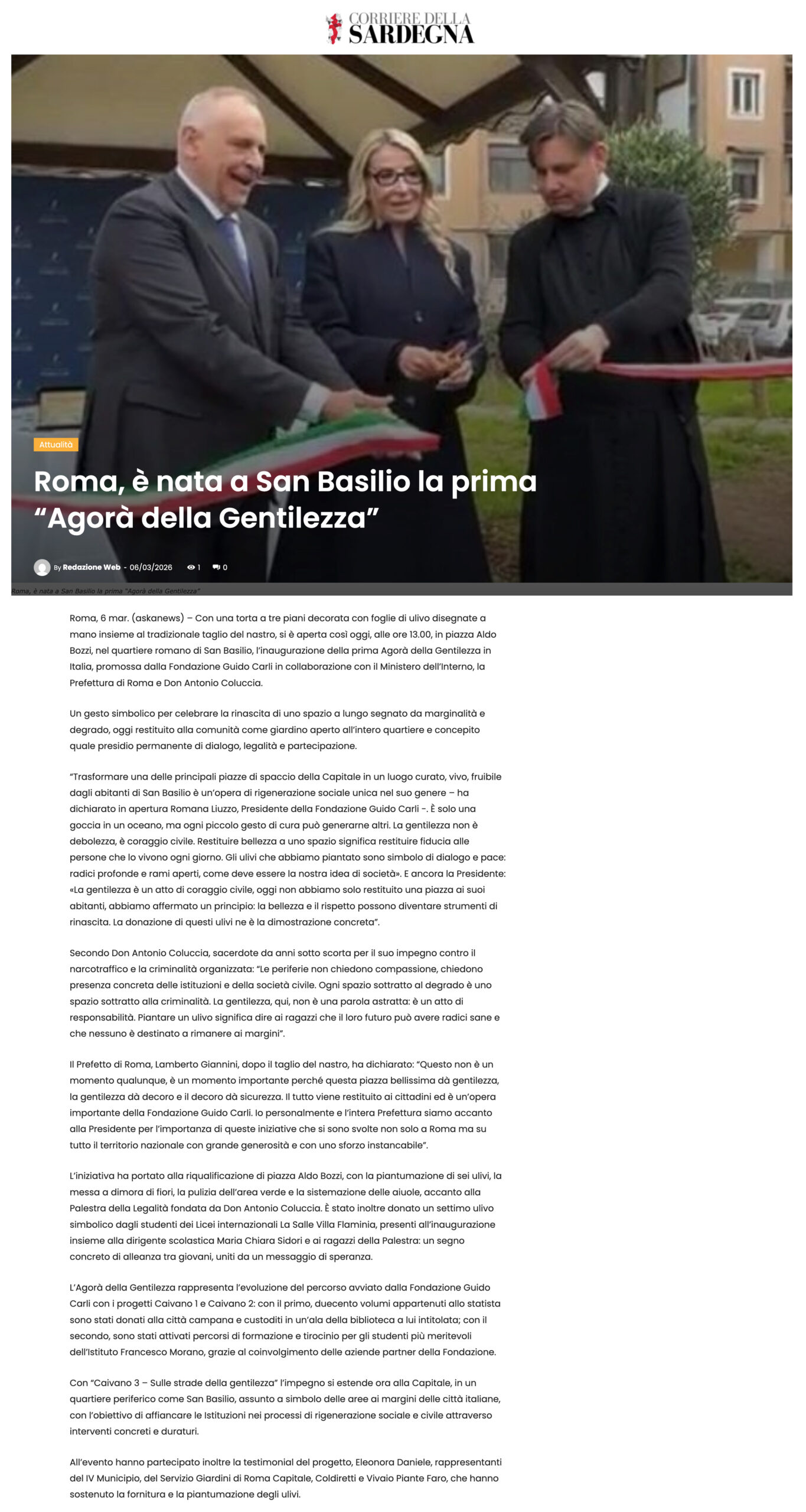 Corriere della Sardegna – Roma, è nata a San Basilio la prima “Agorà della Gentilezza”