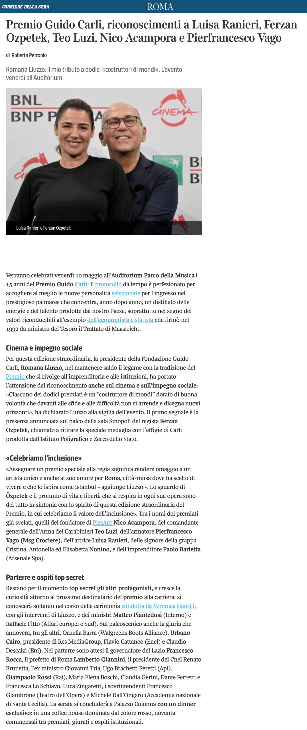 Corriere della Sera Roma – Premio Guido Carli, riconoscimenti a Luisa Ranieri, Ferzan Ozpetek, Teo Luzi, Nico Acampora e Pierfrancesco Vago