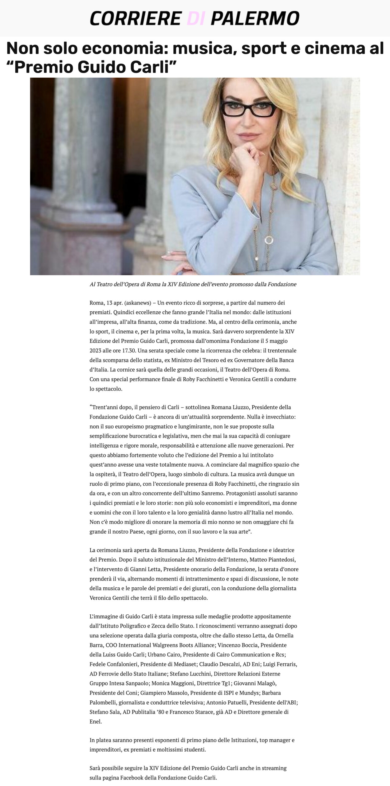 Corriere di Palermo – Non solo economia: musica, sport e cinema al “Premio Guido Carli”
