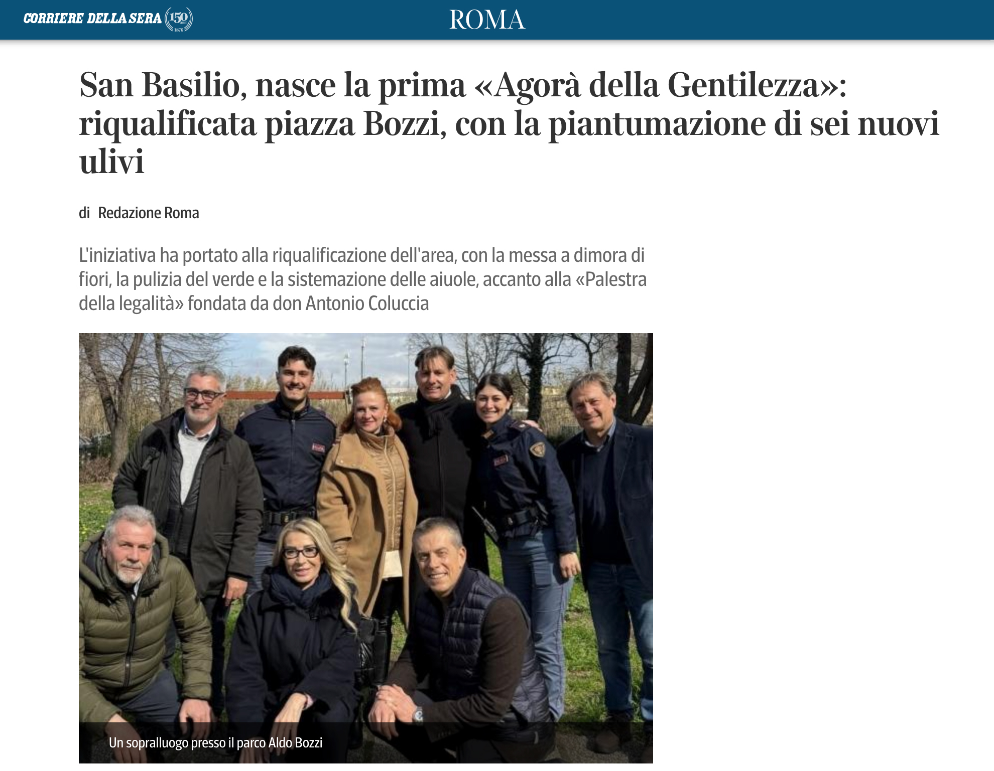 Con una torta a tre piani decorata con foglie di ulivo disegnate a mano insieme al tradizionale taglio del nastro, si è aperta così oggi, alle ore 13.00, in piazza Aldo Bozzi, nel quartiere romano di San Basilio, l’inaugurazione della prima Agorà della Gentilezza in Italia, promossa dalla Fondazione Guido Carli in collaborazione con il Ministero dell’Interno, la Prefettura di Roma e Don Antonio Coluccia. Un gesto simbolico per celebrare la rinascita di uno spazio a lungo segnato da marginalità e degrado, oggi restituito alla comunità come giardino aperto all’intero quartiere e concepito quale presidio permanente di dialogo, legalità e partecipazione. «Trasformare una delle principali piazze di spaccio della Capitale in un luogo curato, vivo, fruibile dagli abitanti di San Basilio è un’opera di rigenerazione sociale unica nel suo genere – ha dichiarato in apertura Romana Liuzzo, Presidente della Fondazione Guido Carli – È solo una goccia in un oceano, ma ogni piccolo gesto di cura può generarne altri. La gentilezza non è debolezza, è coraggio civile. Restituire bellezza a uno spazio significa restituire fiducia alle persone che lo vivono ogni giorno. Gli ulivi che abbiamo piantato sono simbolo di dialogo e pace: radici profonde e rami aperti, come deve essere la nostra idea di società». E ancora la Presidente: «La gentilezza è un atto di coraggio civile, oggi non abbiamo solo restituito una piazza ai suoi abitanti, abbiamo affermato un principio: la bellezza e il rispetto possono diventare strumenti di rinascita. La donazione di questi ulivi ne è la dimostrazione concreta».