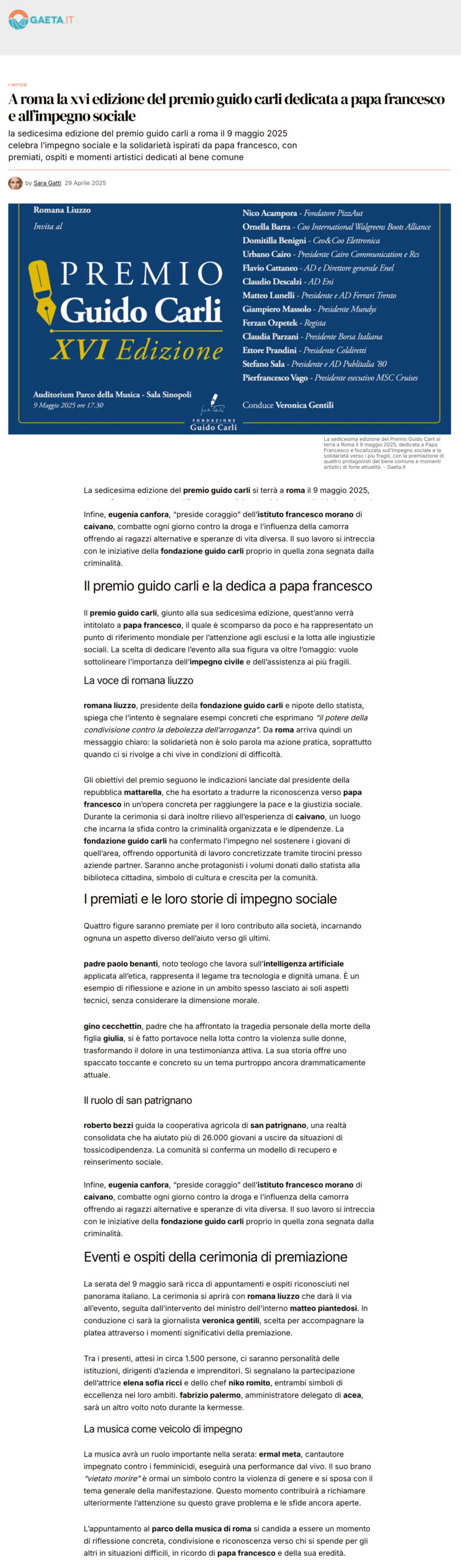 Gaeta.it – A roma la xvi edizione del premio guido carli dedicata a papa francesco e all’impegno sociale
