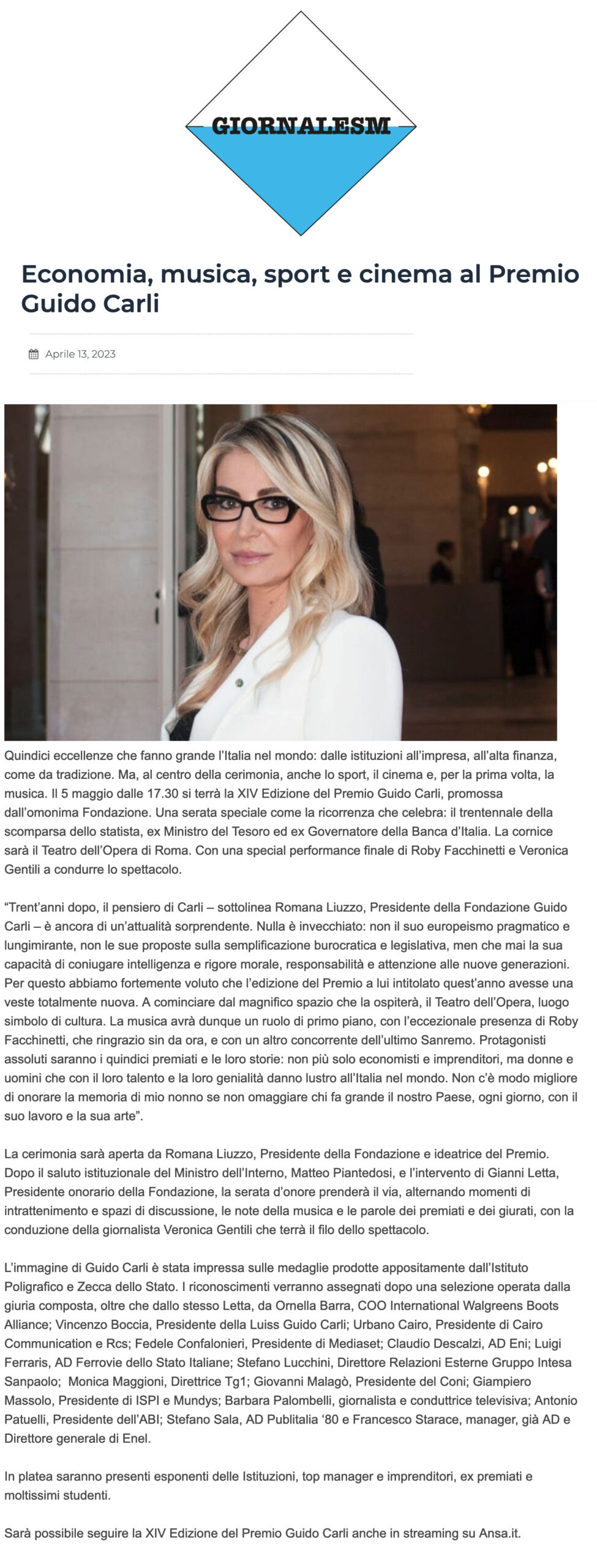 Giornale SM – Economia, musica, sport e cinema al Premio Guido Carli