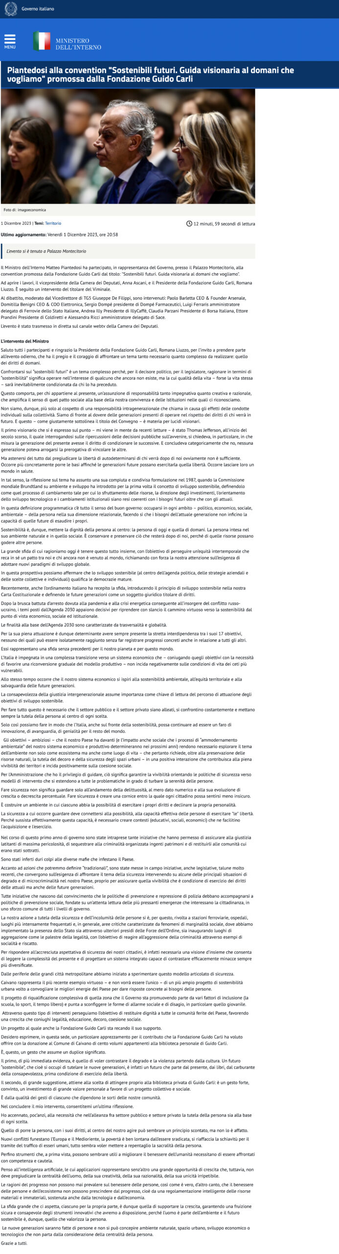 Governo Italiano – Piantedosi alla convention “Sostenibili futuri. Guida visionaria al domani che vogliamo” promossa dalla Fondazione Guido Carli