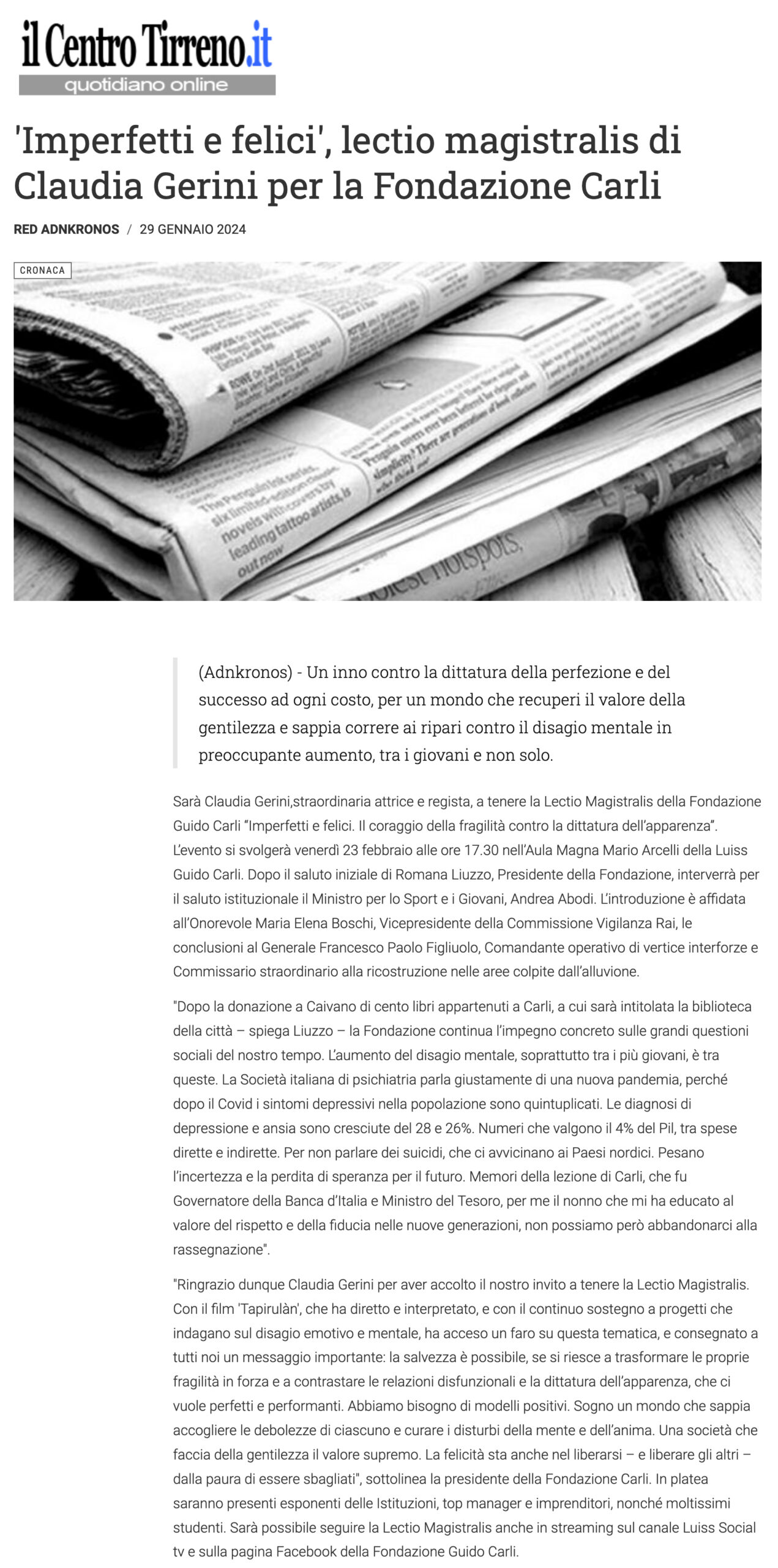 Il Centro Tirreno – ‘Imperfetti e felici’, lectio magistralis di Claudia Gerini per la Fondazione Carli