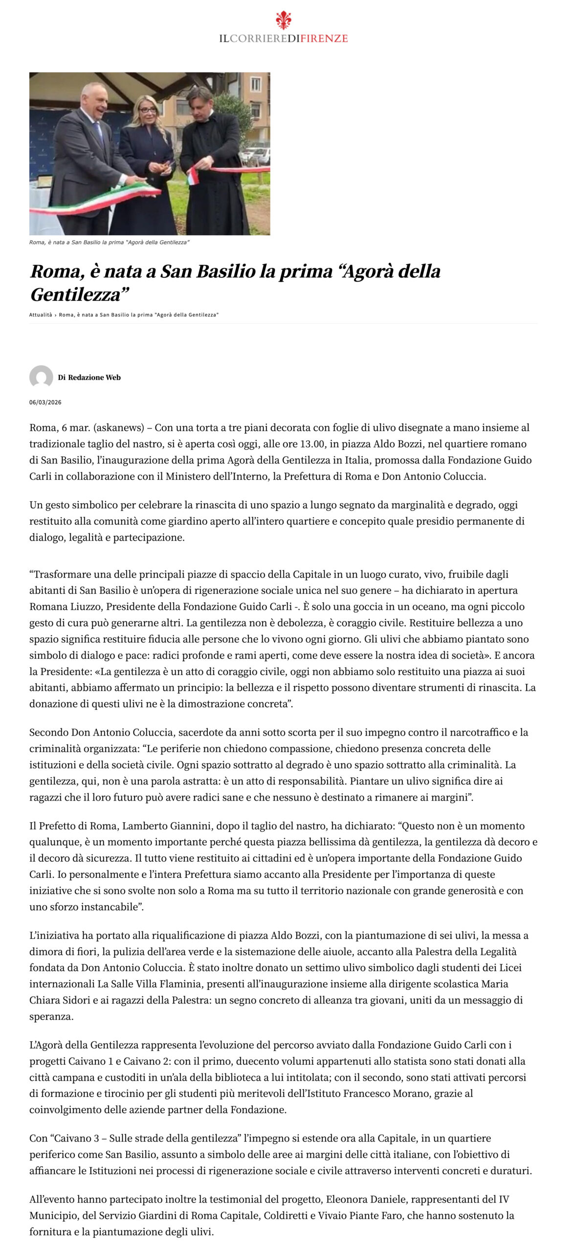 Il Corriere di Firenze – Roma, è nata a San Basilio la prima “Agorà della Gentilezza”