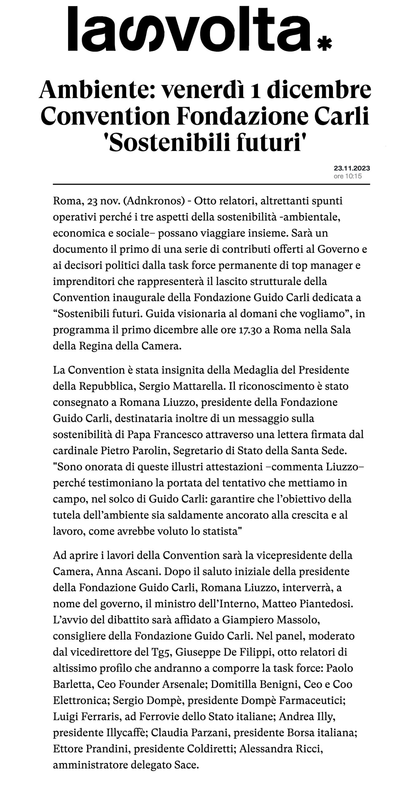 La svolta – Ambiente: venerdì 1 dicembre Convention Fondazione Carli ‘Sostenibili futuri’