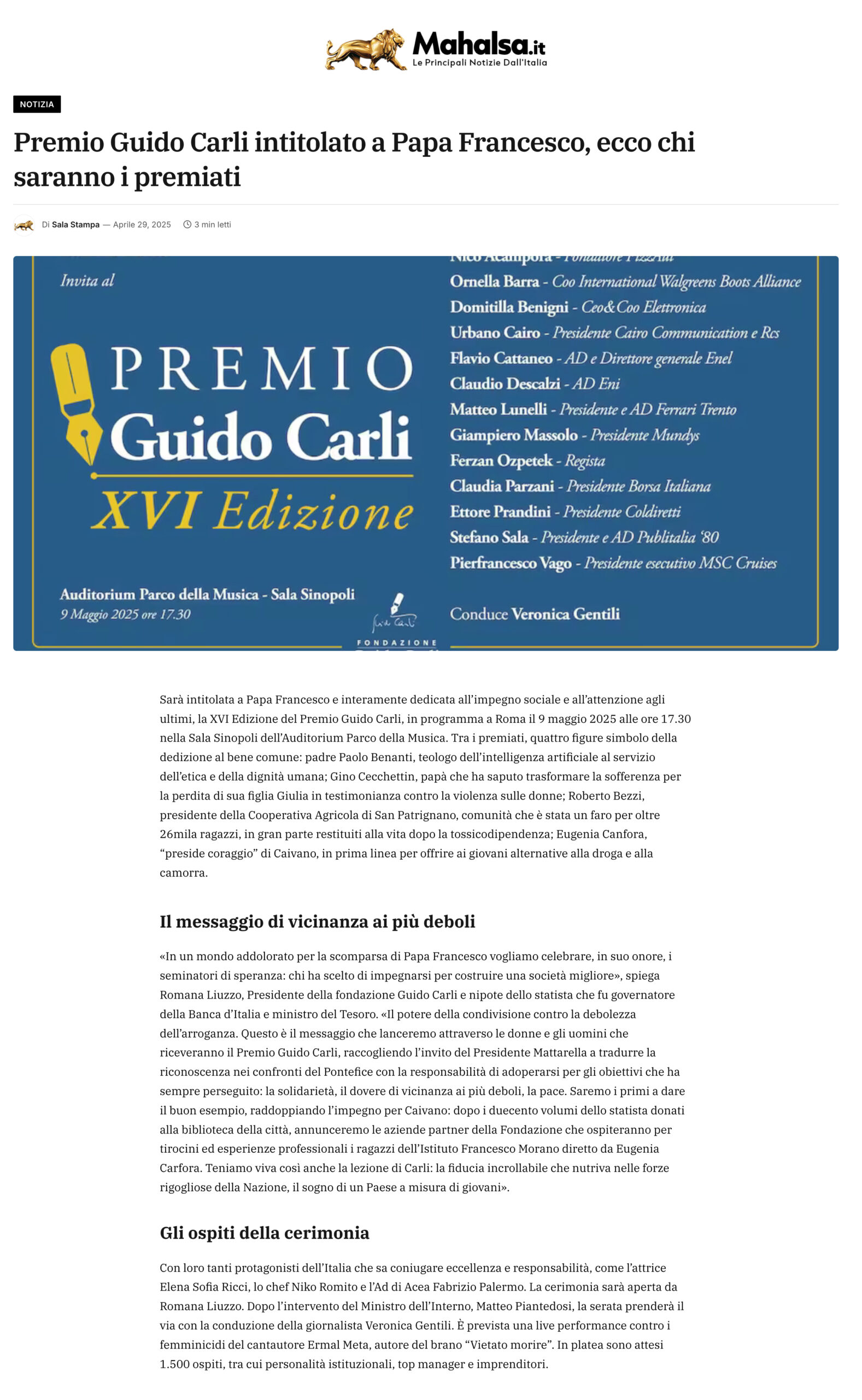 Mahalsa – Premio Guido Carli intitolato a Papa Francesco, ecco chi saranno i premiati