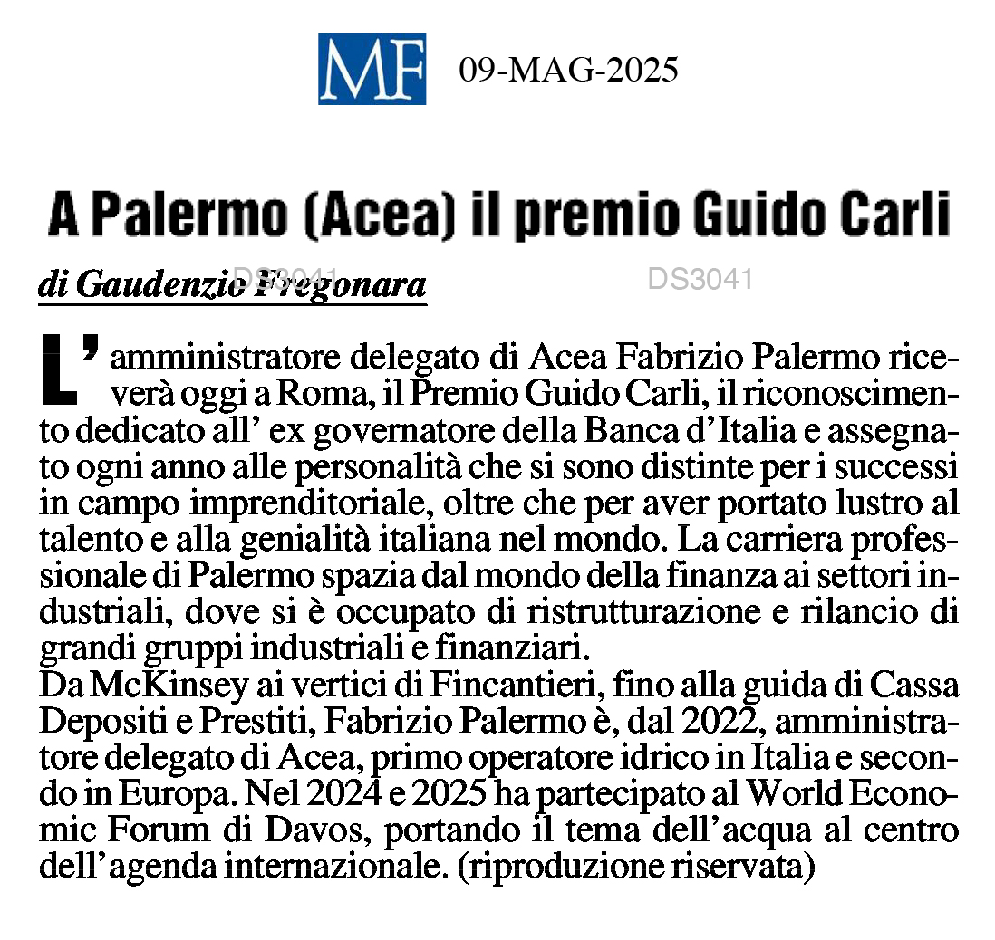 Mf – A Palermo (Acea) il premio Guido Carli