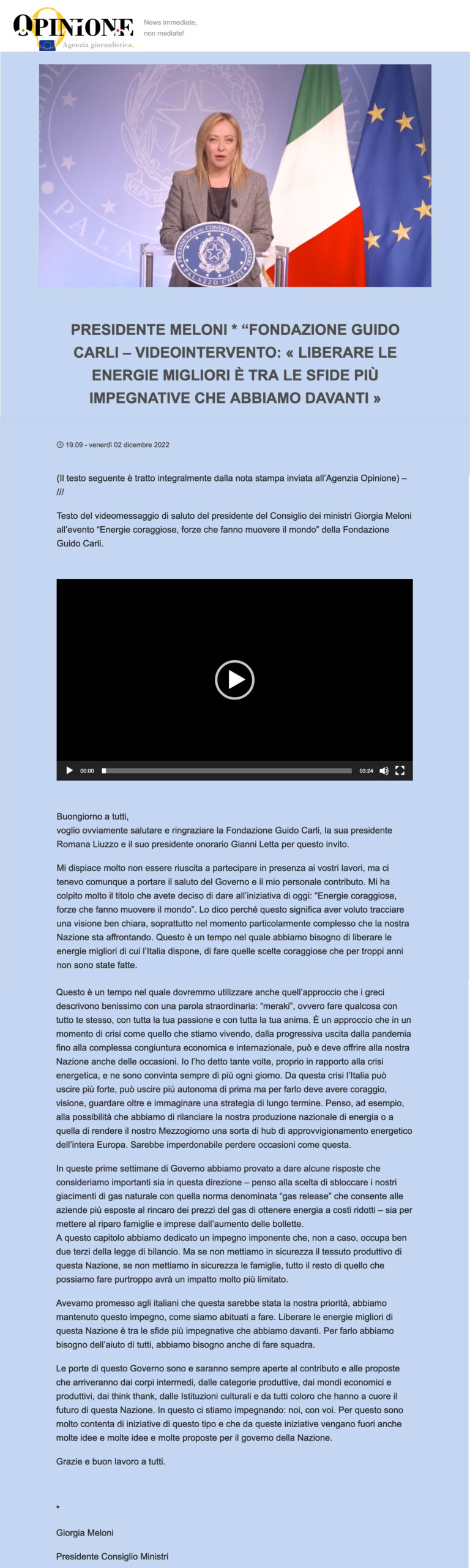Opinione Agenzia Giornalistica – Presidente Meloni “Fondazione Guido carli – Videointervento: «Liberare le enrgie migliori è tra le sfide più impegnative che abbiamo davanti»