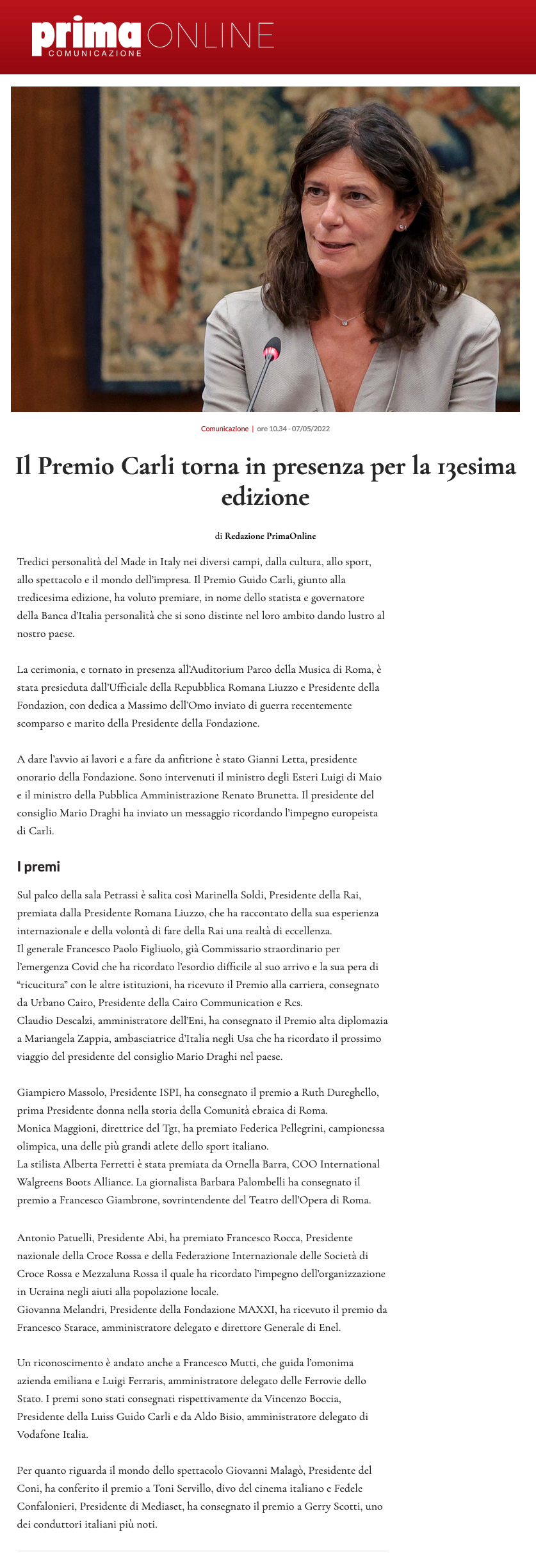 Prima Online – Il Premio Carli torna in presenza per la 13esima edizione