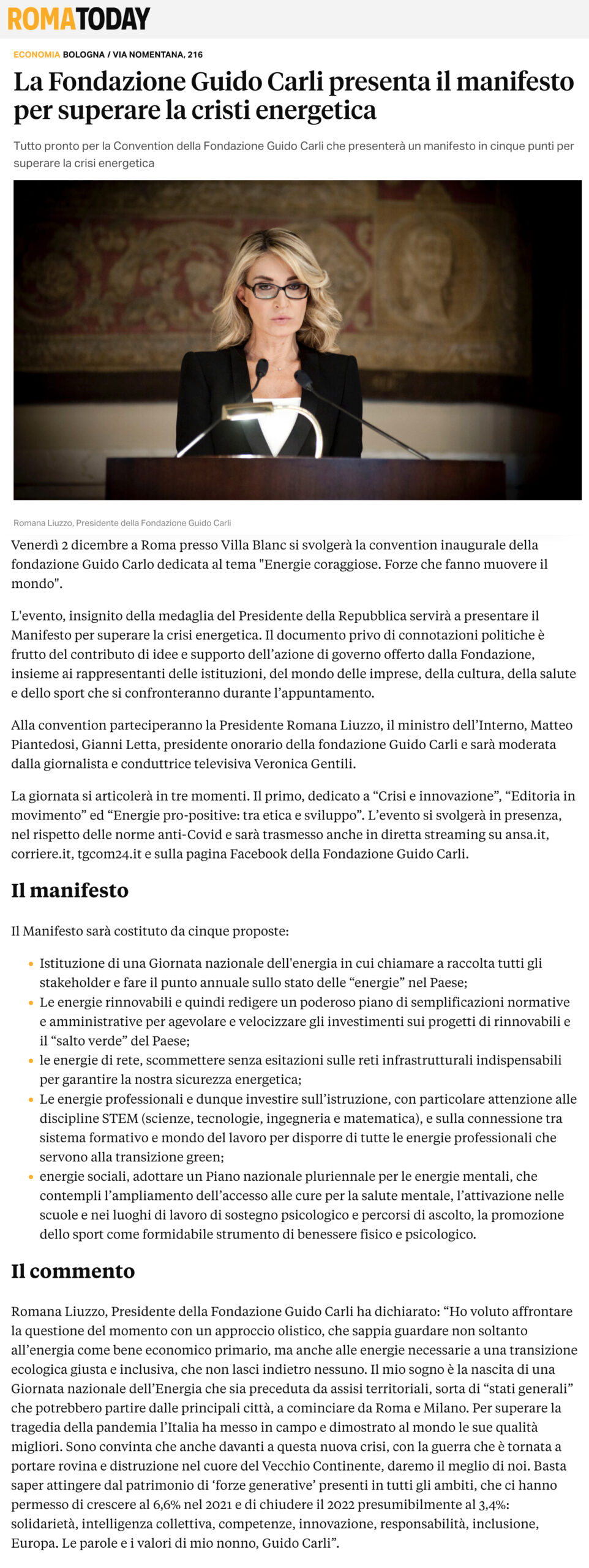 RomaToday – La Fondazione Guido Carli presenta il manifesto per superare la cristi energetica