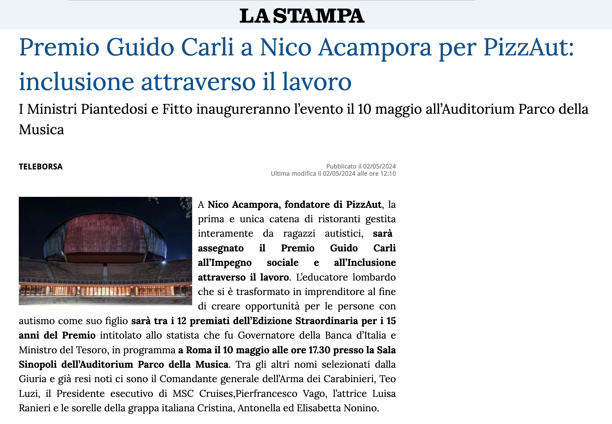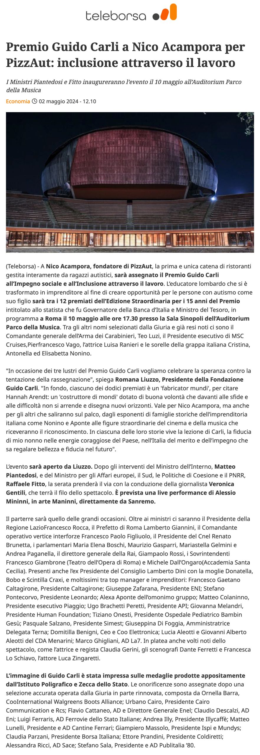 Teleborsa – Premio Guido Carli a Nico Acampora per PizzAut: inclusione attraverso il lavoro
