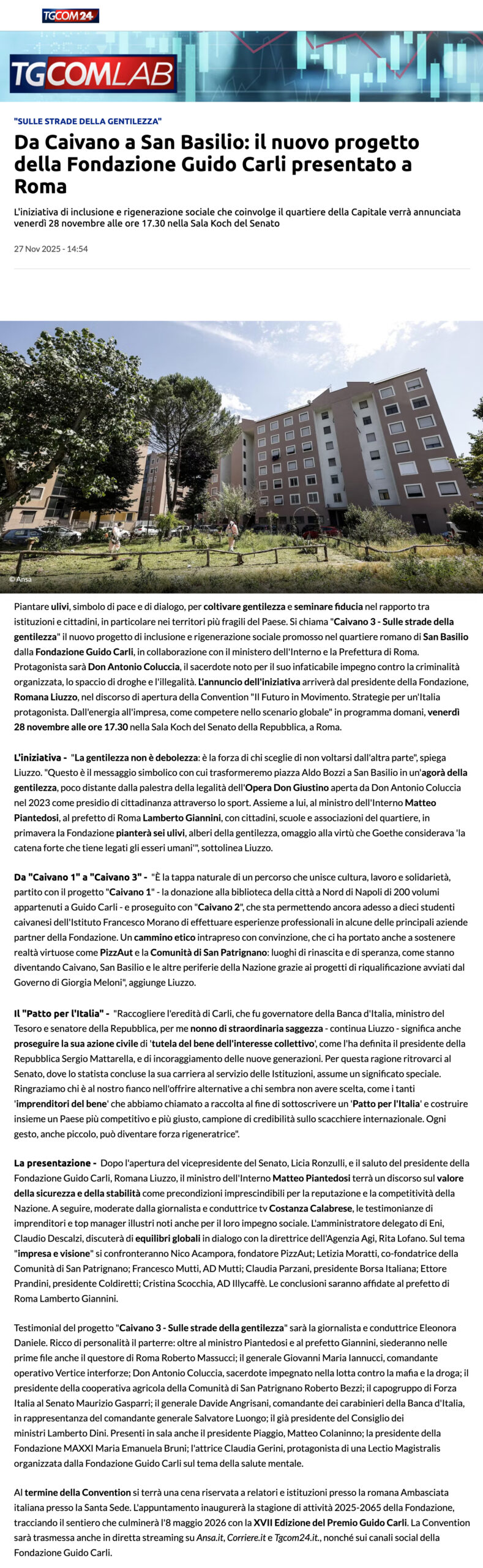TGCOM24 – Da Caivano a San Basilio: il nuovo progetto della Fondazione Guido Carli presentato a Roma