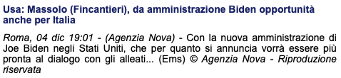 Usa: Massolo (Fincantieri), da amministrazione Biden opportunità anche per Italia