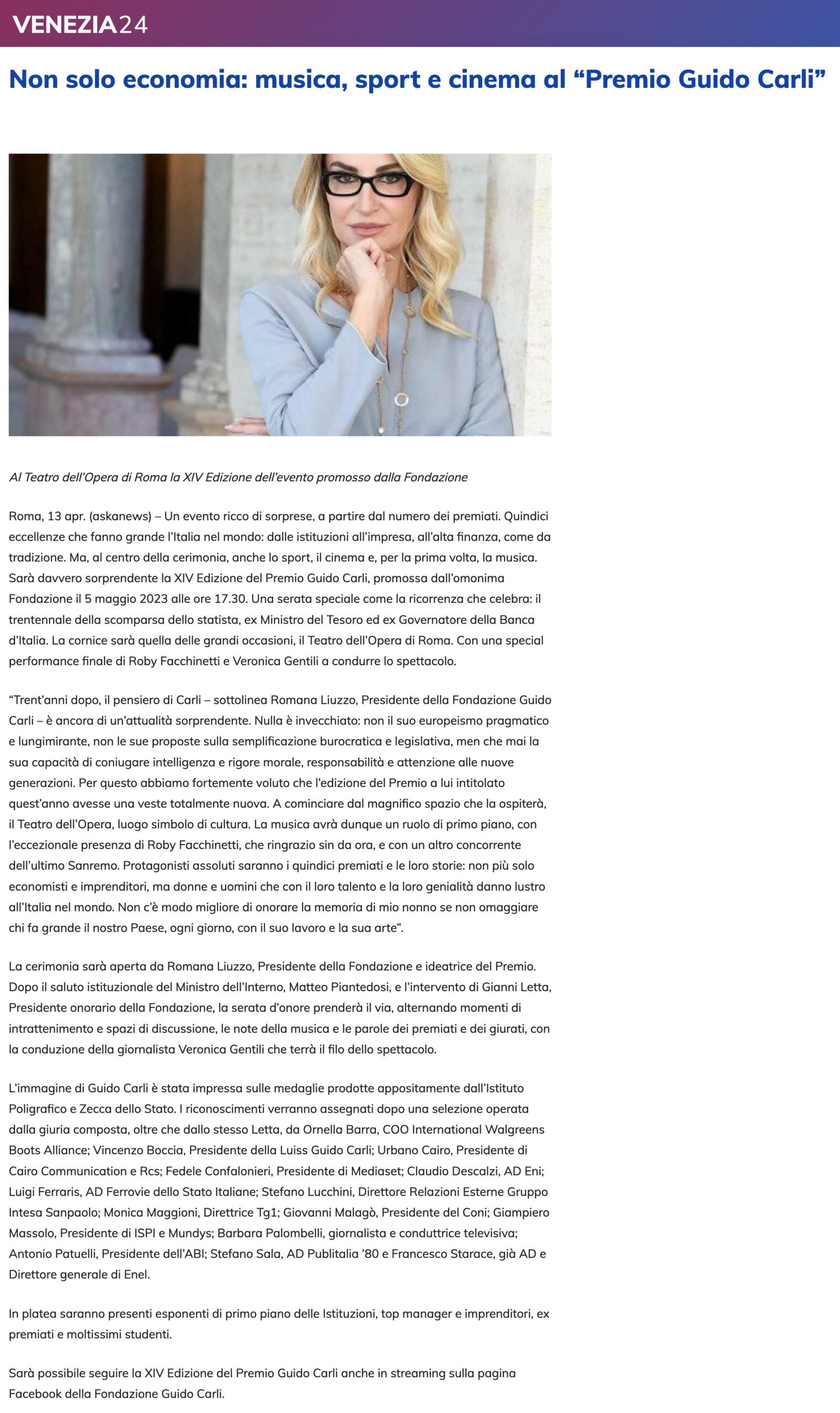 Venezia24 – Non solo economia: musica, sport e cinema al “Premio Guido Carli”